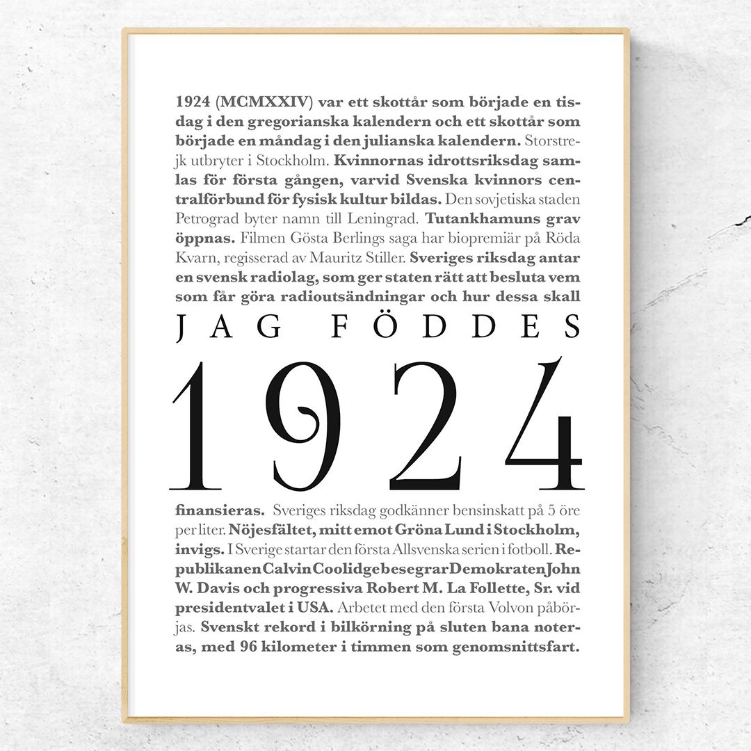 Jag föddes 1924 är en poster för den som kom till världen under år 1924. Kanske dina mor- eller farföräldrar? Detta print består av texten ”Jag föddes 1924” omgiven av de största nyhetshändelserna från året 1924. På postern finns nyheter så som påbörjandet av konstruktionen av den första Volvon och starten av Kvinnornas Idrottsriksdag.