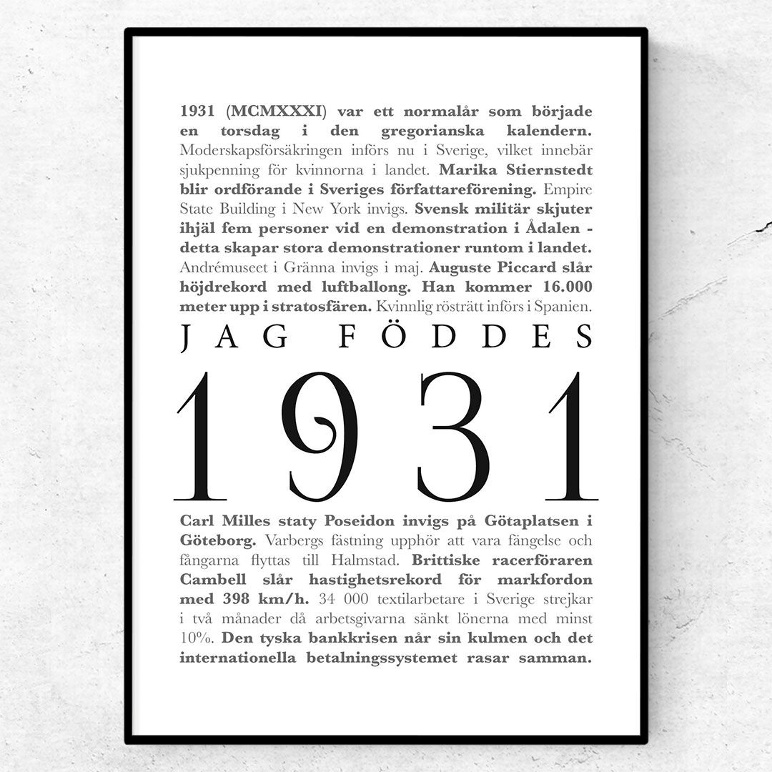 Du hittar alla våra årtal här. Köp denna fina 1931-poster idag och få den levererad inom några dagar. Postern trycks på matt bestruket kvalitetspapper i 200 gram.