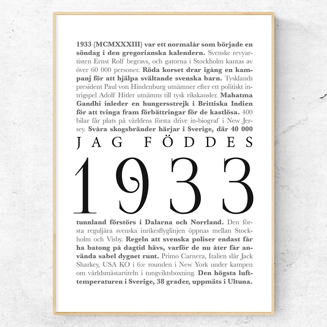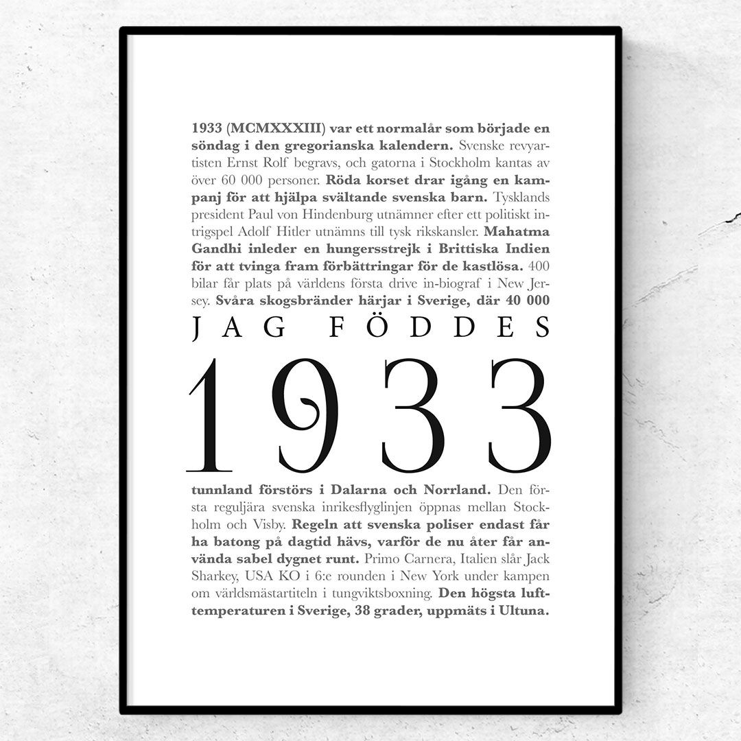 Jag föddes 1933 är en poster för den person som föddes 1933. Kanske någon släkting till dig, en mor- eller farförälder? Denna fina poster består av texten ”Jag föddes 1933” omgiven av de största nyhetshändelserna från just 1933. Ett ganska mörkt år med starten på det som senare skulle leda till andra världskriget. Men jag har försökt få med även lite positiva händelser från året.