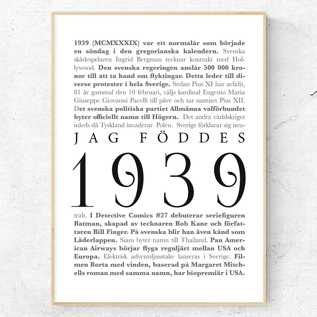Jag föddes 1939 är en informativ men ändå snygg och stilren årtalsposter för den som föddes 1939. Postern består av den stora texten ”Jag föddes 1939” och detta är sedan omringat av kända nyhetshändelser från året. Såklart var 1939 ett ganska mörkt år och starten på flera mörka år. Men såklart finns det några ljusglimtar i nyheterna från 1939.