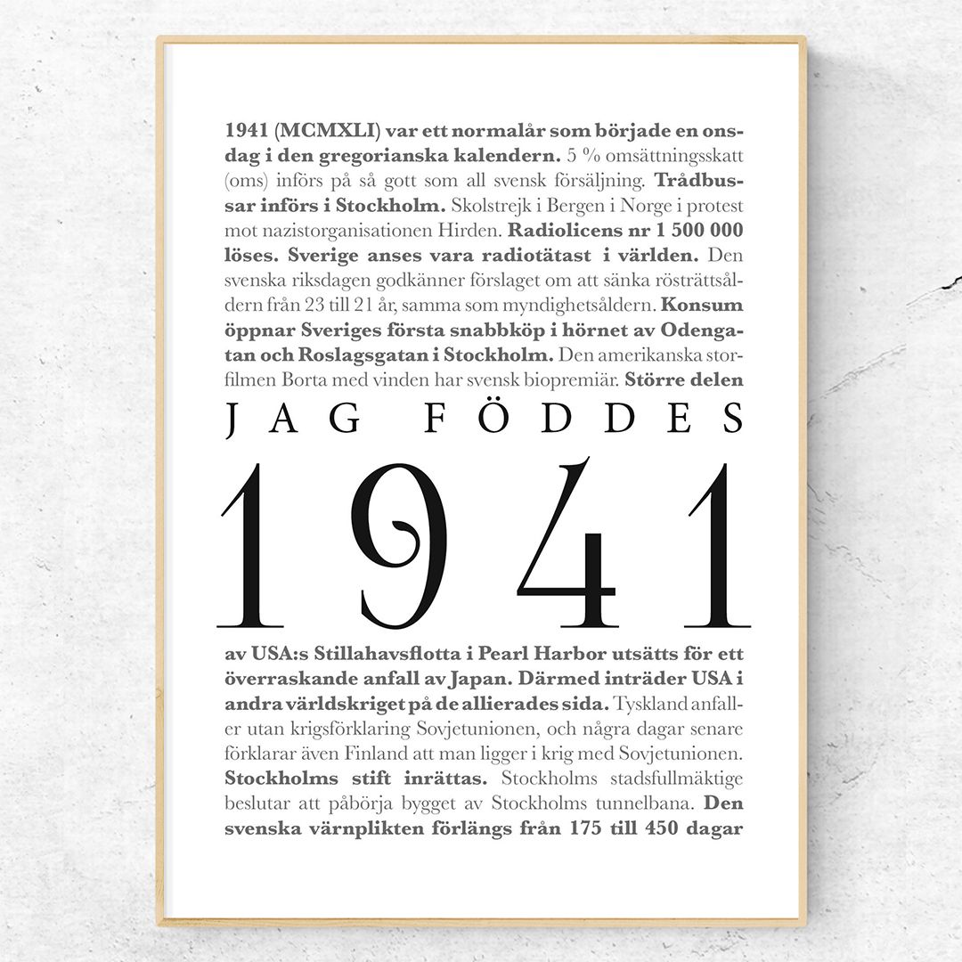 Jag föddes 1941 är en poster för den som kom till världen under år 1941. Kanske dina mor- eller farföräldrar? Detta print består av texten ”Jag föddes 1941” omgiven av de största nyhetshändelserna från året 1941. Även om andra världskriget pågick runtom i Europa så har jag försökt fokusera även på de positiva nyheterna. Till exempel påbörjandet av bygget av Stockholms tunnelbana.