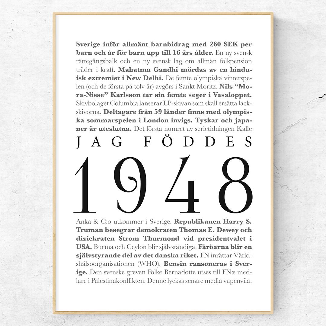 Jag föddes 1948 är en snygg affisch för den som är född 1948. Postern består av den stora texten ”Jag föddes 1948” omgiven av stora och kända nyhetshändelser från året 1948. Från händelser som mordet på Ghandi till LP-skivans debut på marknaden. Alla årtal hittar du här. Saknar du något årtal? Kontakta mig så tar jag fram en poster med ditt årtal.