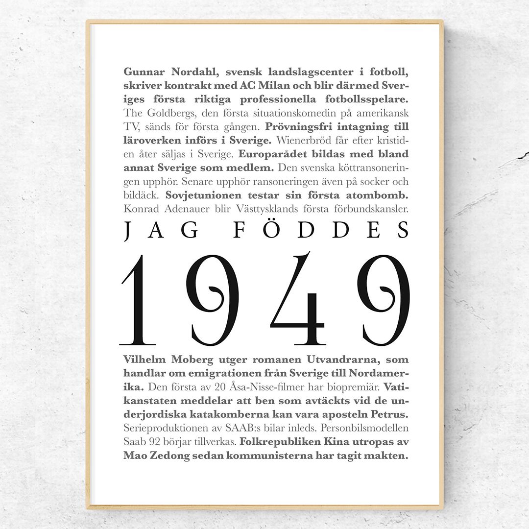 Jag föddes 1949 är en stilren och snygg poster för den som är född 1949. Postern består av den rubriktexten ”Jag föddes 1949” och runtom står de största nyhetshändelserna från året. Här ryms vår första professionella fotbollsspelare, Gunnar Nordahl och fler nyheter från den internationella politiken, så som bildandet av Folkrepubliken Kina.