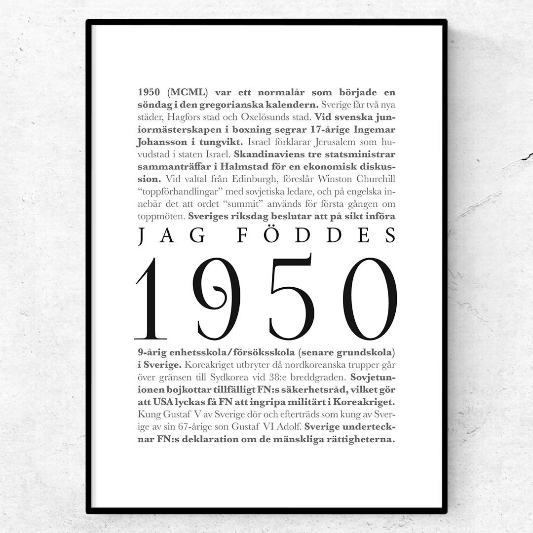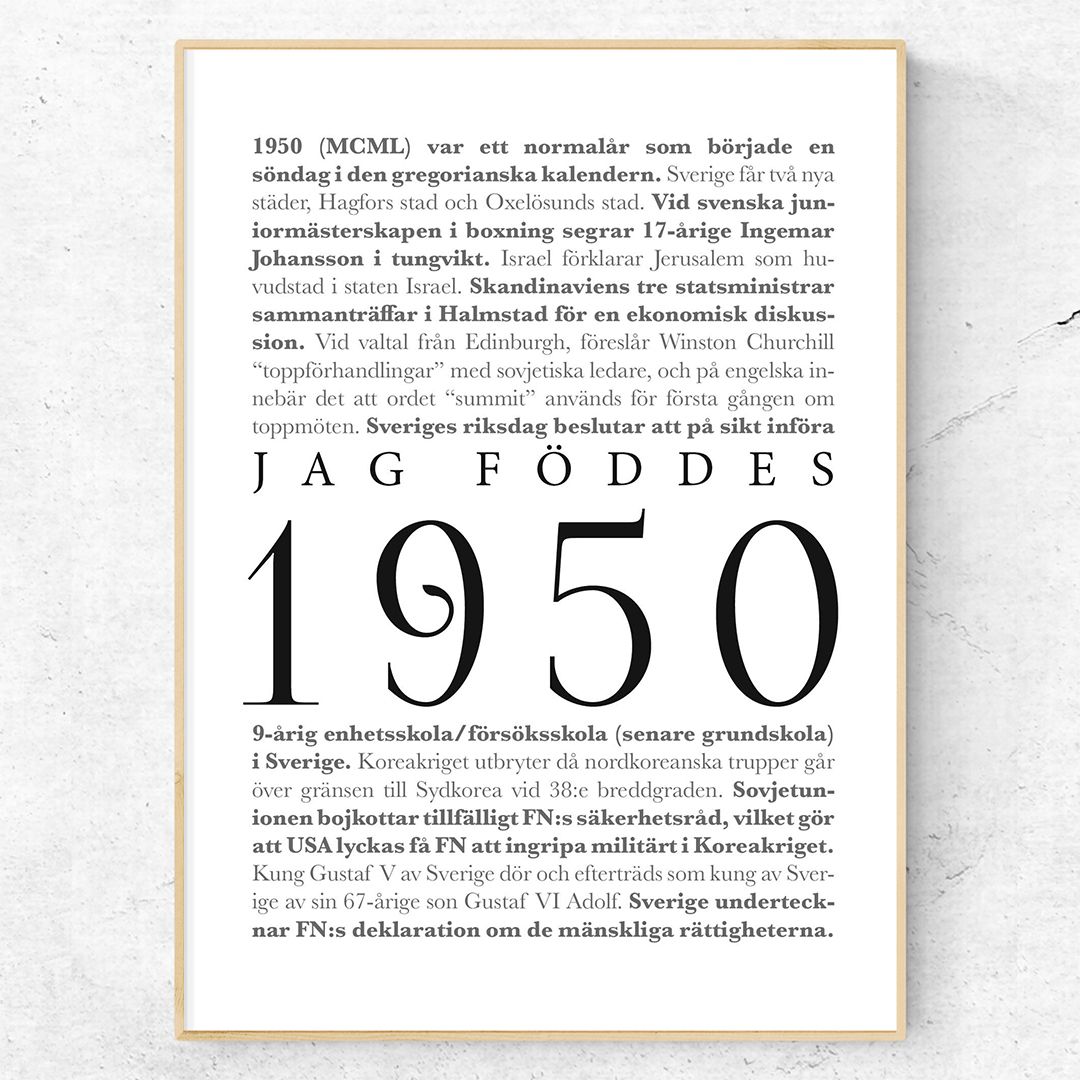 Jag föddes 1950 är en stilren poster för den som föddes 1950. Postern består av den snygga texten ”Jag föddes 1950” och runtomkring finns de största och kändaste nyhetshändelserna från året. Till exempel starten på Korea-kriget och Sveriges undertecknande av deklarationen om de mänskliga rättigheterna .