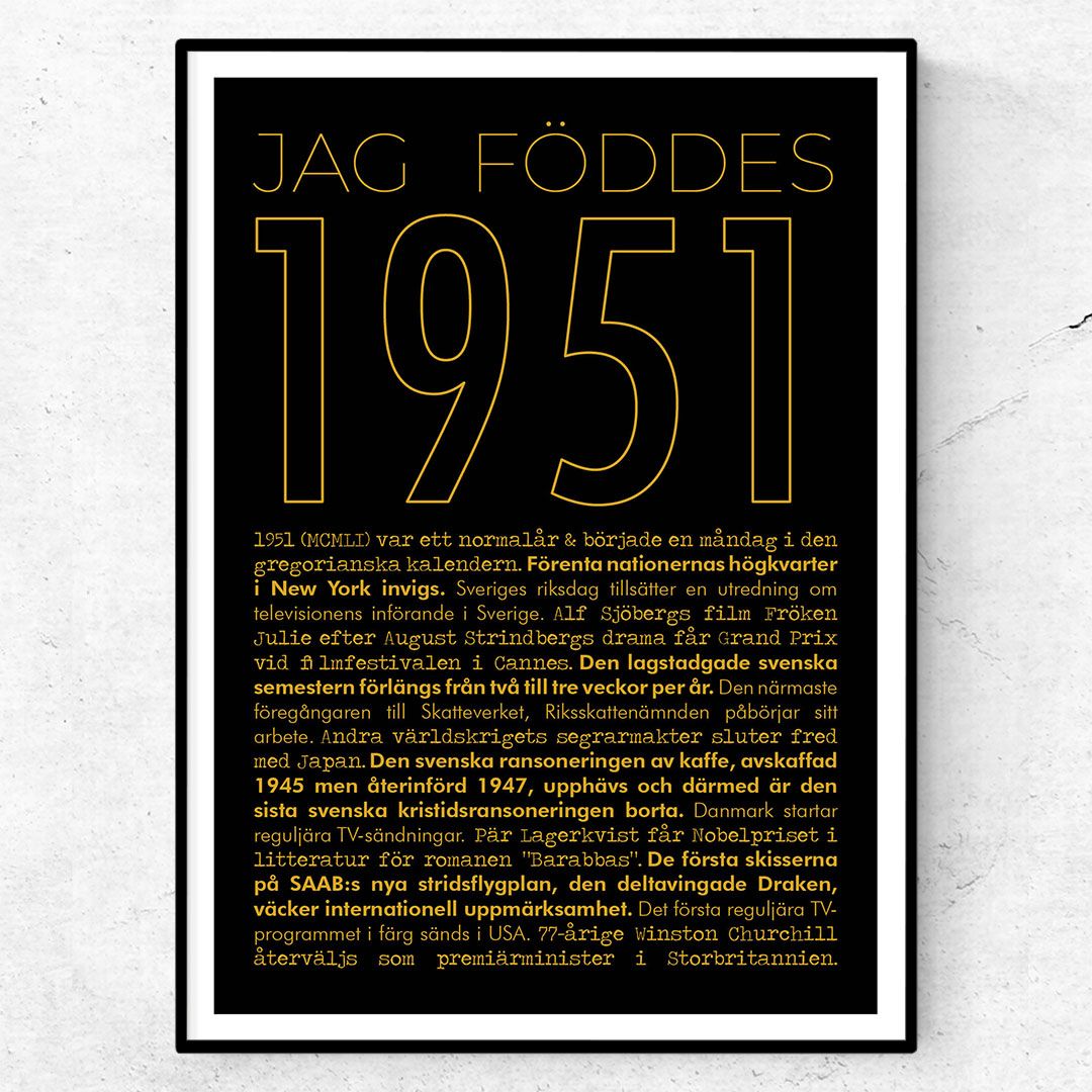 Postern 1951 guld är en informativ och snygg årtalsposter för den som föddes 1951. Postern tillhör guld-årtalskollektionen och har en exklusiv design. Guldkollektionen finns bara i två storlekar. Du kan köpa till ram till din affisch och skapa en snygg tavla. Affischen består av texten ”Jag föddes 1951” omgiven av de största nyhetshändelserna från året. Du kan också byta ut standardtexten ”Jag föddes” mot andra alternativ.
