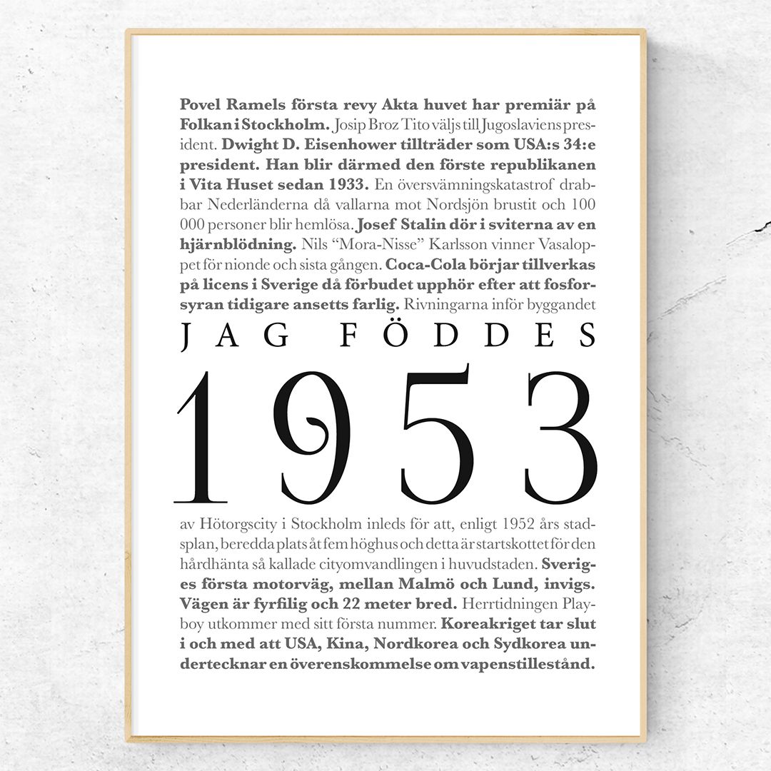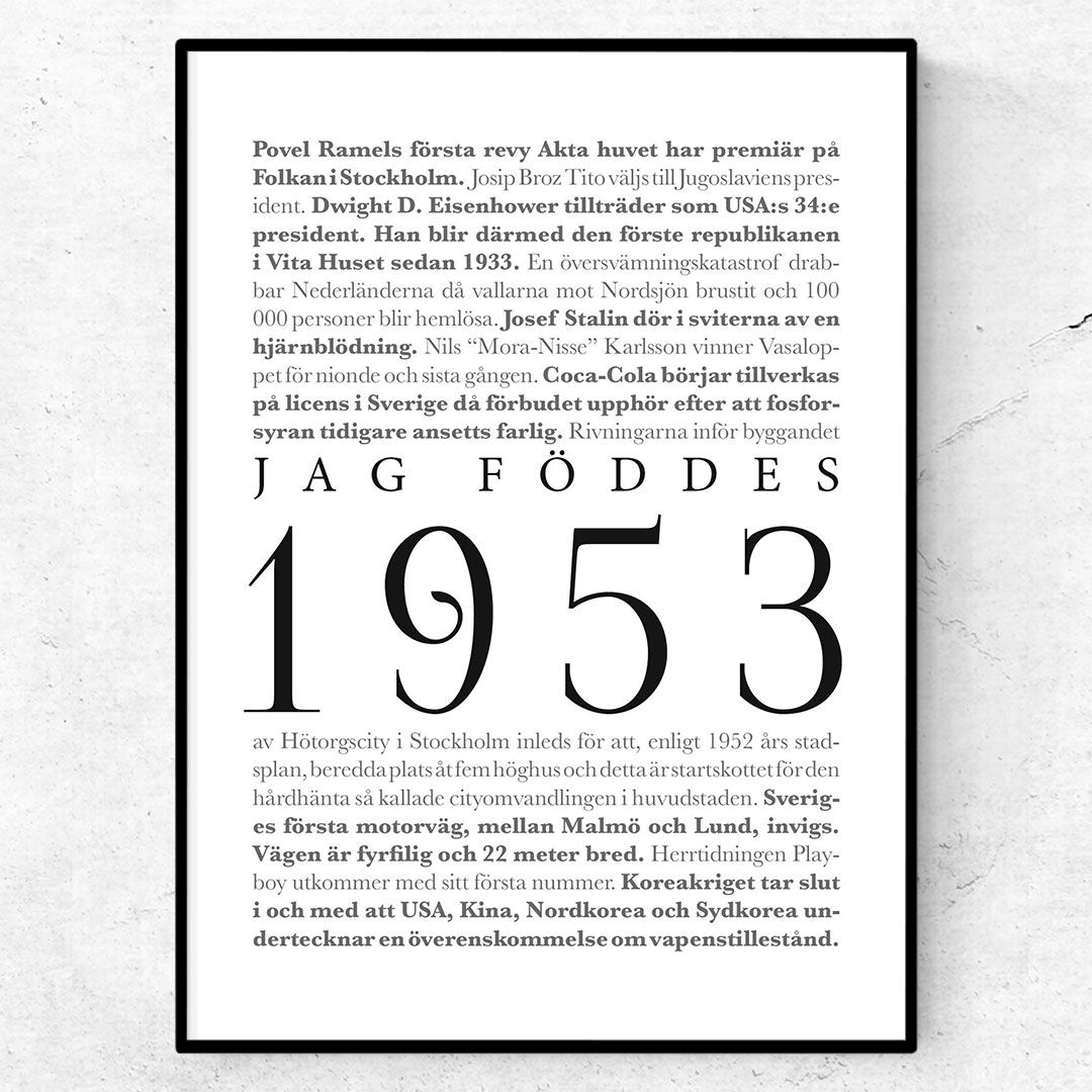 Jag föddes 1953 är en cool poster för den som är född 1953. Postern består av den stora texten ”Jag föddes 1953” omgiven av stora och kända nyhetshändelser från året 1953. Från händelser som Stalins död till Sveriges första motorväg. Alla årtal hittar du här. Saknar du något årtal? Kontakta mig så tar jag fram en poster med ditt årtal.