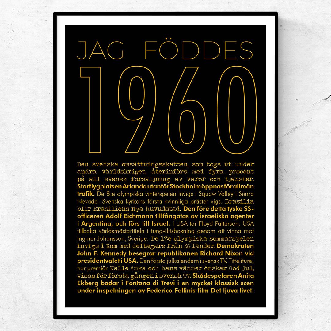 Postern 1960 guld är en informativ och snygg årtalsposter för den som föddes 1960. Postern tillhör guld-årtalskollektionen och har en exklusiv design. Guldkollektionen finns bara i två storlekar. Du kan köpa till ram till din affisch och skapa en snygg tavla. Affischen består av texten ”Jag föddes 1960” omgiven av de största nyhetshändelserna från året. Du kan också byta ut standardtexten ”Jag föddes” mot andra alternativ.