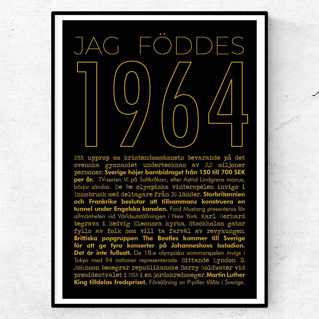 Du hittar alla våra årtal här. Köp denna fina 1964-poster idag och få den levererad inom några dagar. Postern trycks på matt bestruket kvalitetspapper i 180g.