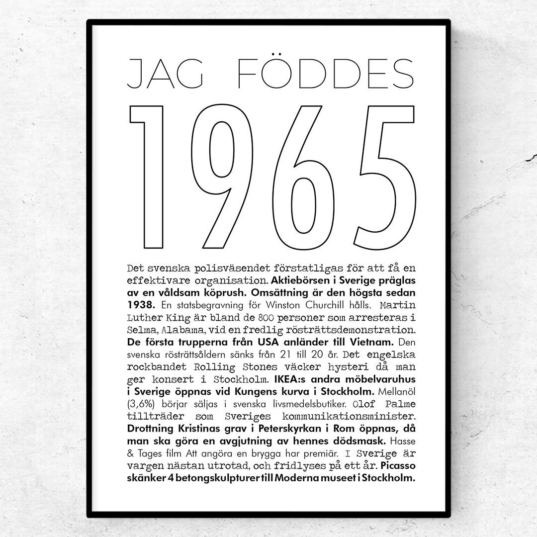 Du hittar alla våra årtal här. Köp denna fina 1965-poster idag och få den levererad inom några dagar. Postern trycks på matt bestruket kvalitetspapper i 180g.