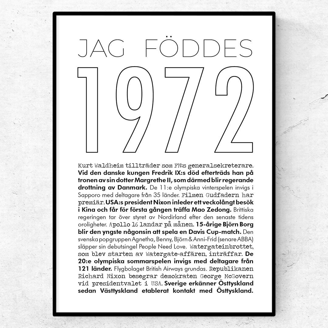 Du hittar alla våra årtal här. Köp denna fina 1972-poster idag och få den levererad inom några dagar. Postern trycks på matt bestruket kvalitetspapper i 180g.