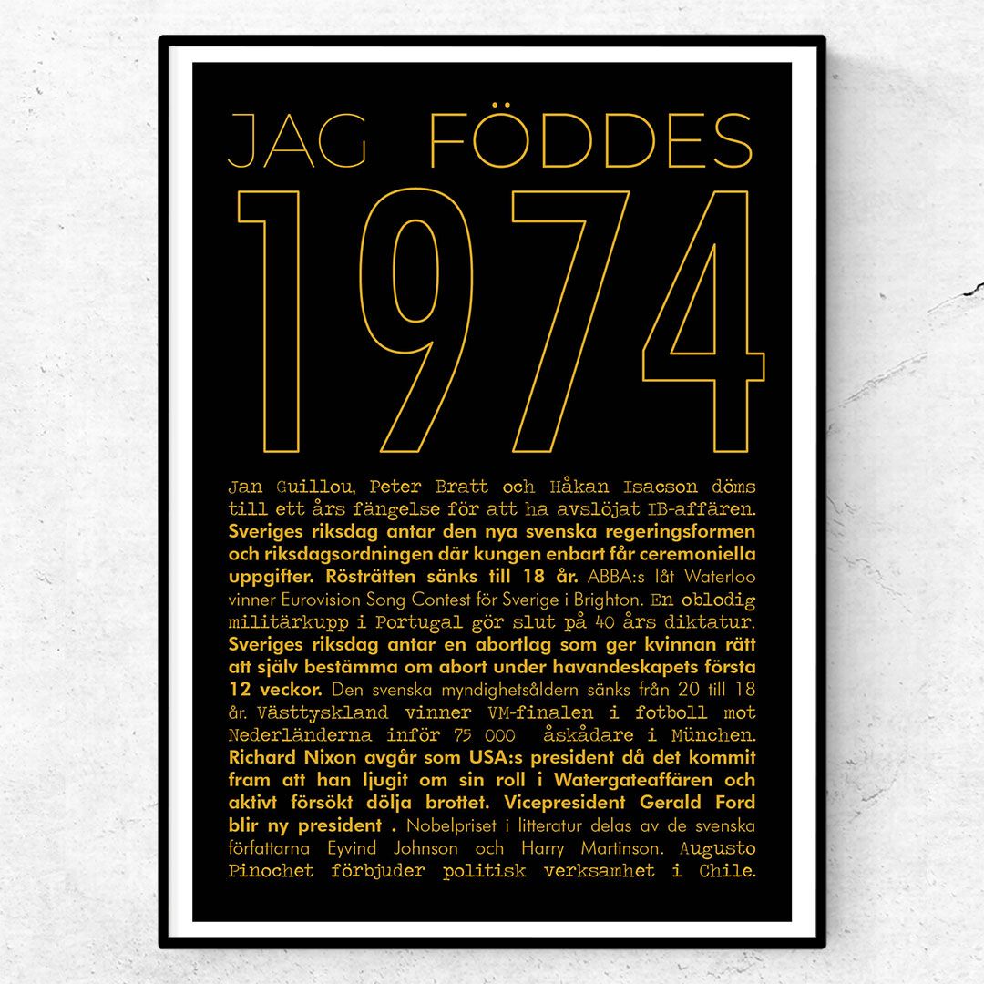 Postern 1974 guld är en informativ och snygg årtalsposter för den som föddes 1974. Postern tillhör guld-årtalskollektionen och har en exklusiv design. Guldkollektionen finns bara i två storlekar. Du kan köpa till ram till din affisch och skapa en snygg tavla. Affischen består av texten ”Jag föddes 1974” omgiven av de största nyhetshändelserna från året. Du kan också byta ut standardtexten ”Jag föddes” mot andra alternativ.