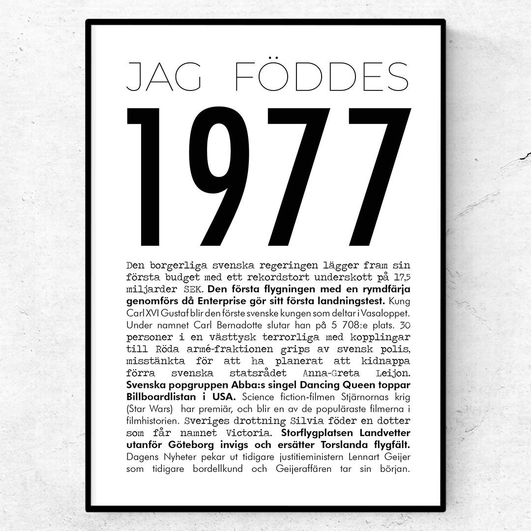 Du hittar alla våra årtal här. Köp denna fina 1977-poster ur den moderna kollektionen av årtalsposters och få den levererad inom några dagar. Postern trycks på matt bestruket kvalitetspapper i 180g.
