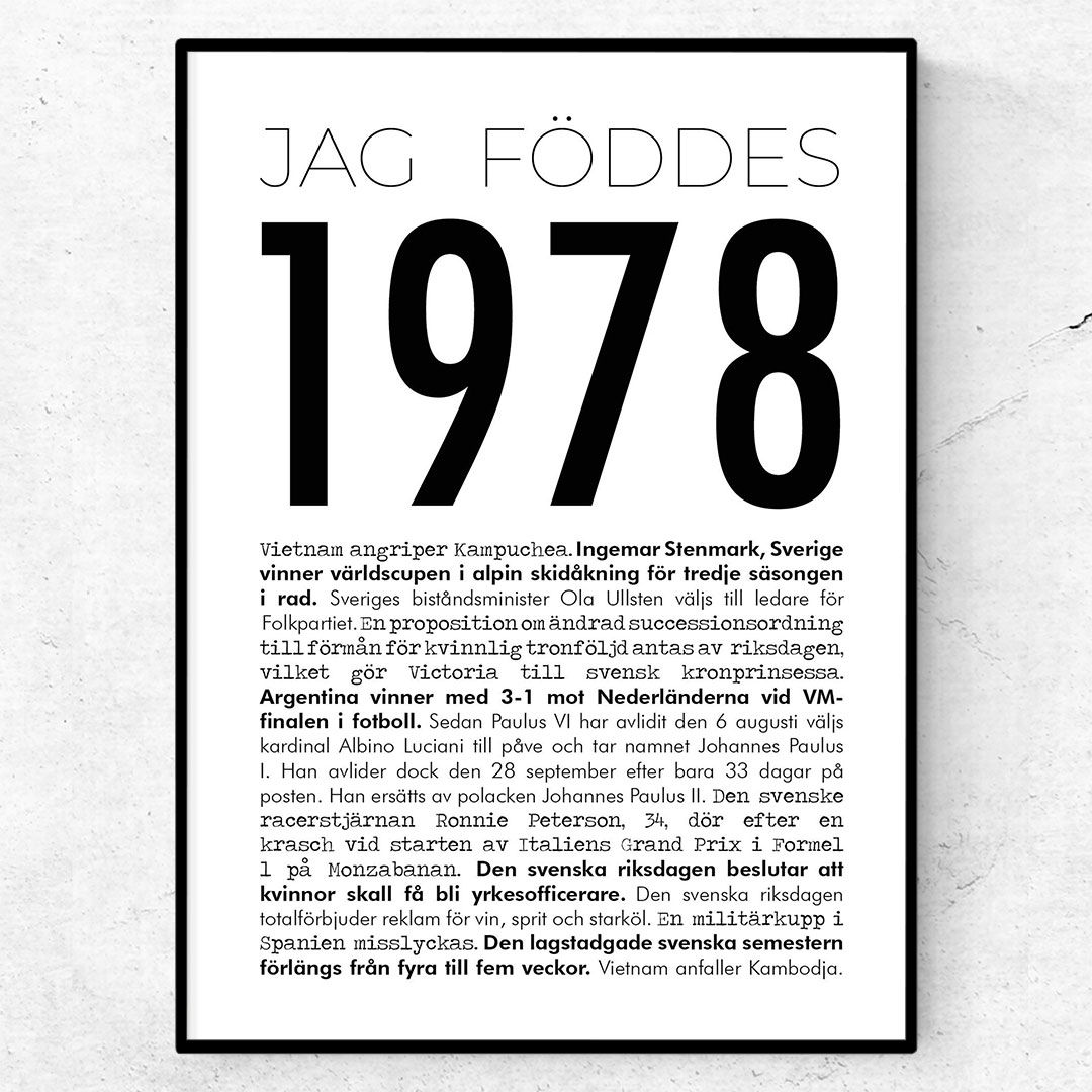 Du hittar alla våra årtal här. Köp denna fina 1978-poster ur den moderna kollektionen av årtalsposters och få den levererad inom några dagar. Postern trycks på matt bestruket kvalitetspapper i 180g.