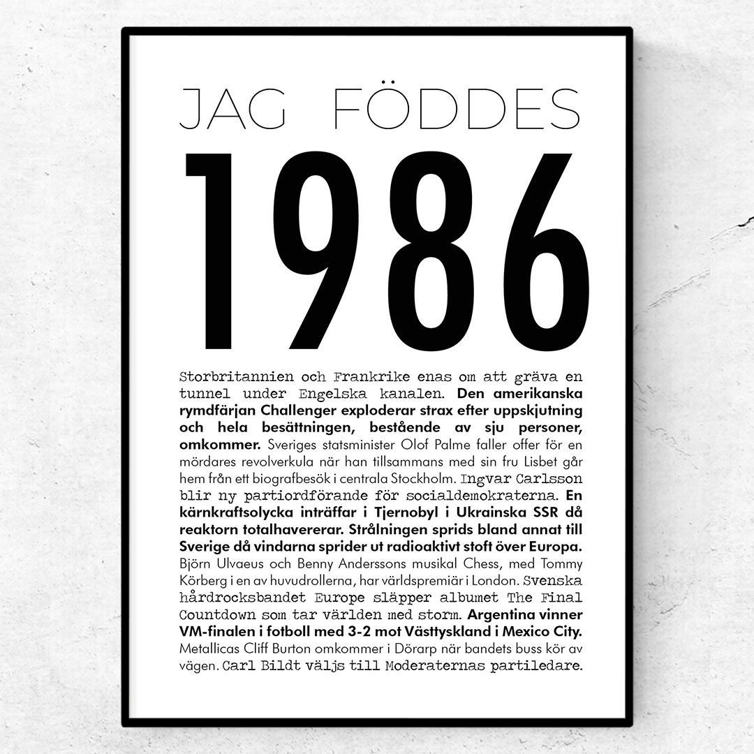 Du hittar alla våra årtal här. Köp denna fina 1986-poster ur den moderna kollektionen av årtalsposters och få den levererad inom några dagar. Postern trycks på matt bestruket kvalitetspapper i 180g.