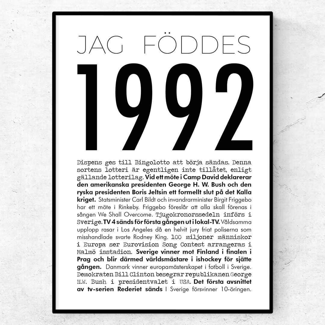 Du hittar alla våra årtal här. Köp denna fina 1992-poster ur den moderna kollektionen av årtalsposters och få den levererad inom några dagar. Postern trycks på matt bestruket kvalitetspapper i 180g.