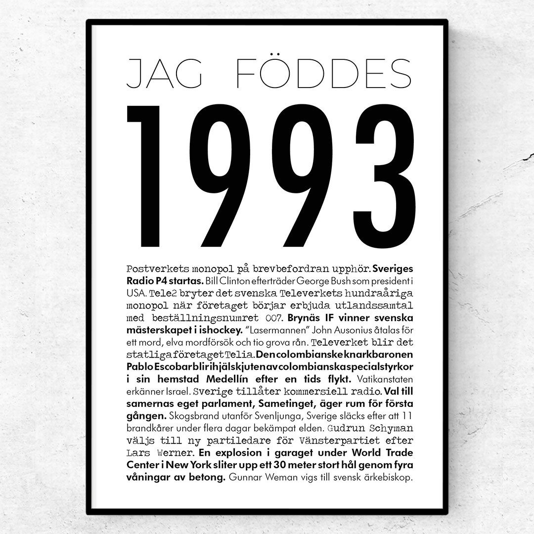 Du hittar alla våra årtal här. Köp denna fina 1993-poster ur den moderna kollektionen av årtalsposters och få den levererad inom några dagar. Postern trycks på matt bestruket kvalitetspapper i 180g.