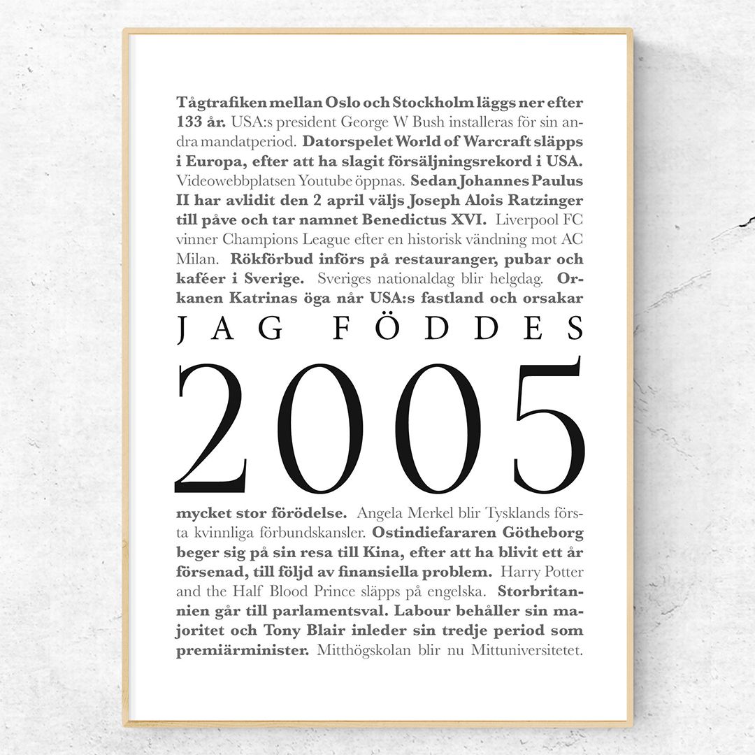 Jag föddes 2005 är en stilren och cool poster för den som är född 2005. Postern består av den rubriktexten ”Jag föddes 2005” och runtom står de största nyhetshändelserna från året. Alla årtal hittar du här. Saknar du något årtal? Kontakta mig så tar jag fram en poster med ditt årtal. Köp denna 2005-poster idag och få den levererad inom några dagar. Postern trycks på matt bestruket kvalitetspapper i 180g och passar både direkt på väggen eller i en snygg ram.