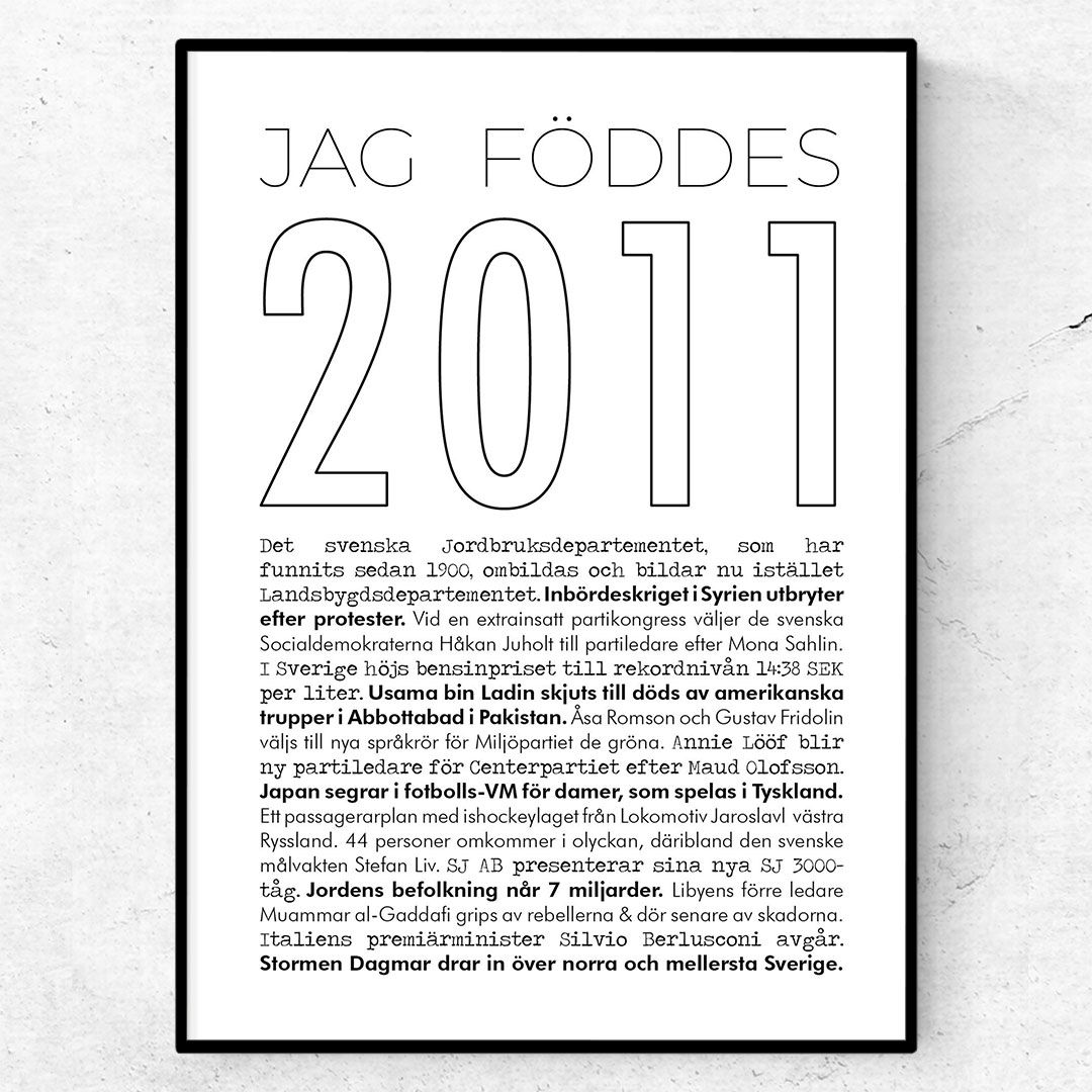 Postern 2011 linje är en stilistisk och stilren årtalsposter för den som föddes 2011 Postern tillhör linje-årtalskollektionen och har en tunn och enkel design – men med samma spännande nyhetsfakta som övriga posters. Du kan också lägga till en ram och skapa en tavla. Denna poster består av texten ”Jag föddes 2011 samt de kändaste nyhetshändelserna från året. Du kan också byta ut standardtexten ”Jag föddes” mot andra alternativ.