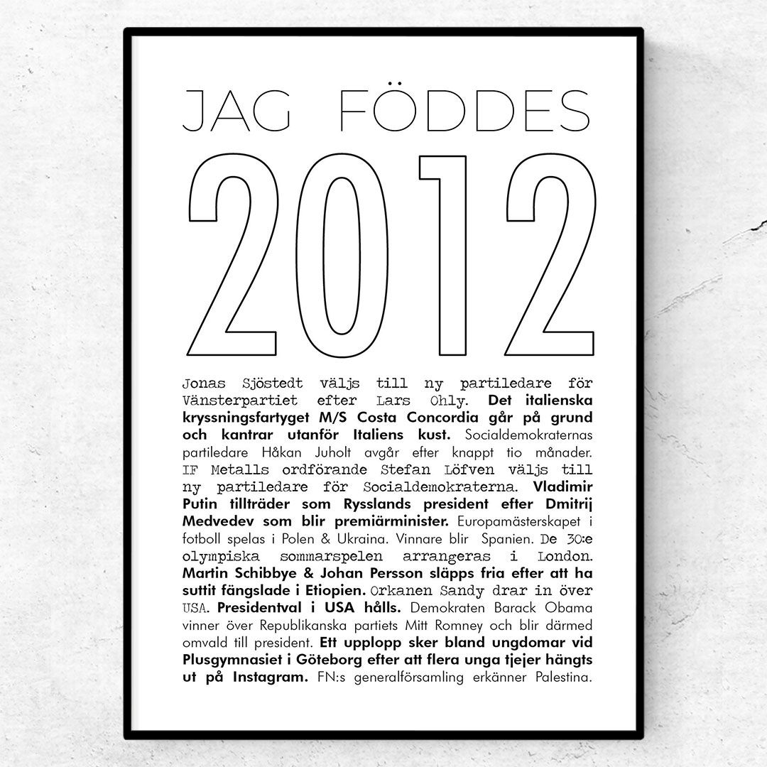 Postern 2012 linje är en stilistisk och stilren årtalsposter för den som föddes 2012. Postern tillhör linje-årtalskollektionen och har en tunn och enkel design – men med samma spännande nyhetsfakta som övriga posters. Du kan också lägga till en ram och skapa en tavla. Denna poster består av texten ”Jag föddes 2012 samt de kändaste nyhetshändelserna från året. Du kan också byta ut standardtexten ”Jag föddes” mot andra alternativ.