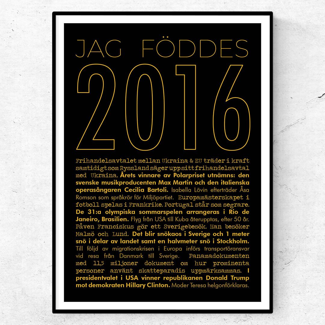 Postern 2016 guld är en informativ och snygg årtalsposter för den som föddes 2016. Postern tillhör guld-årtalskollektionen och har en exklusiv design. Guldkollektionen finns bara i två storlekar. Du kan köpa till ram till din affisch och skapa en snygg tavla. Affischen består av texten ”Jag föddes 2016” omgiven av de största nyhetshändelserna från året. Du kan också byta ut standardtexten ”Jag föddes” mot andra alternativ.
