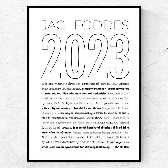 Årtalsposter för 2023 i stilren linjestil. 2023 linje är en stilistisk årtalsposter för den som föddes under det händelserika 2023. Postern tillhör linje-årtalskollektionen och har en tunn och enkel design – men med samma spännande nyhetsfakta som övriga posters. Denna poster har texten ”Jag föddes 2023” samt de stora nyhetshändelserna från året.