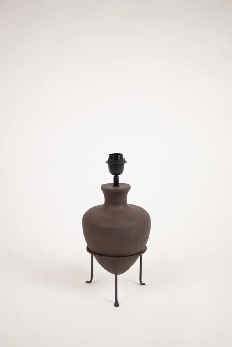 Denna lampa kombinerar en mjukt formad keramikbas med en stabil ställning i gjutjärn. Den matta ytan och jordnära tonen ger ett lugnt och rustikt uttryck.