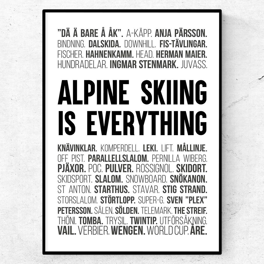 Vår alpina-poster finns äntligen i butiken! En perfekt tavla för dig som älskar alpin skidåkning och slalom. Postern består av texten Alpine skiing is everything omgivet av olika ord och termer från den alpina skidåkningens värld.