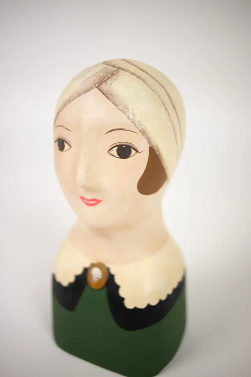 Handgjord och handmålad byst, inspirerad av 1920-talets Art Deco. Låt den pryda en hylla och framhäv dess skönhet och hantverk.