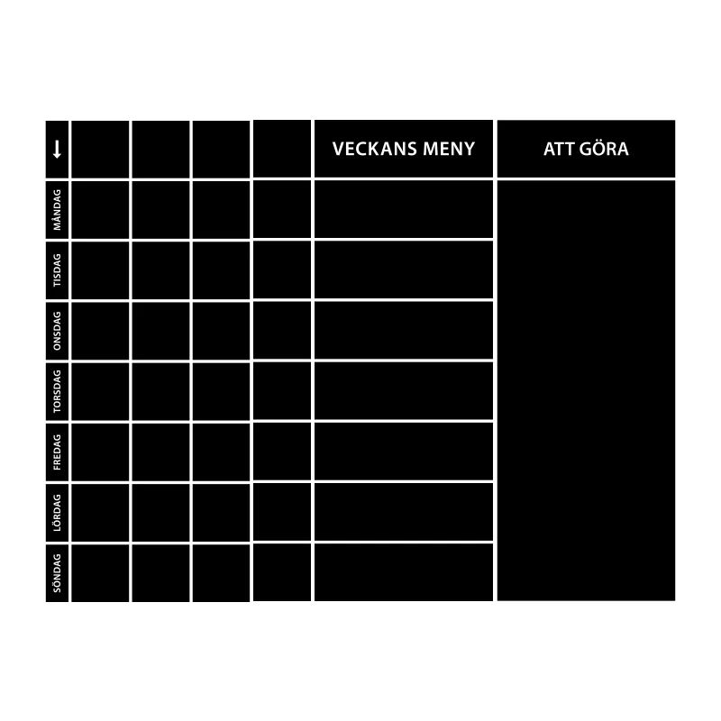 Att göra-tavlan matchar måtten på den utbyggbara planeringstavlan med kolumner, som du kan använda för att hålla koll på aktiviteter för olika familjemedlemmar! Det passar alltså också att kombinera med menytavla och extra kolumner som du själv rubriksätter som du så önskar!