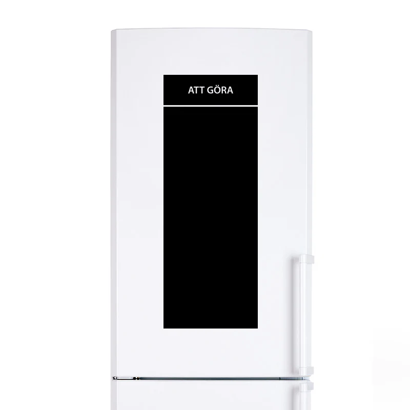 OBS: Har du för avsikt att montera stickern på dörren till kyl eller frys, var extra noga med att kontrollera att ytan håller för att klistra något på. Du kan testa med en vanlig bit tejp. Vissa rostfria kylskåp har ett ytskikt som lätt skadas och som inte lämpar sig för dekaler. Är dörren välvd så bör att göra-tavlan monteras från ena långsidan – inte uppifrån eftersom det då blir svårare att få vinylen slät utan att luftbubblor uppstår bakom de sammanhängande ytorna i dekoren.