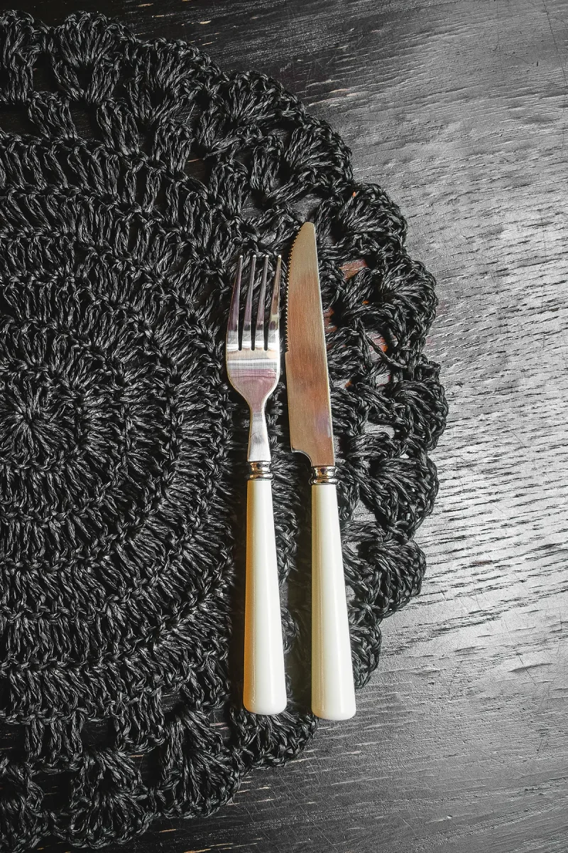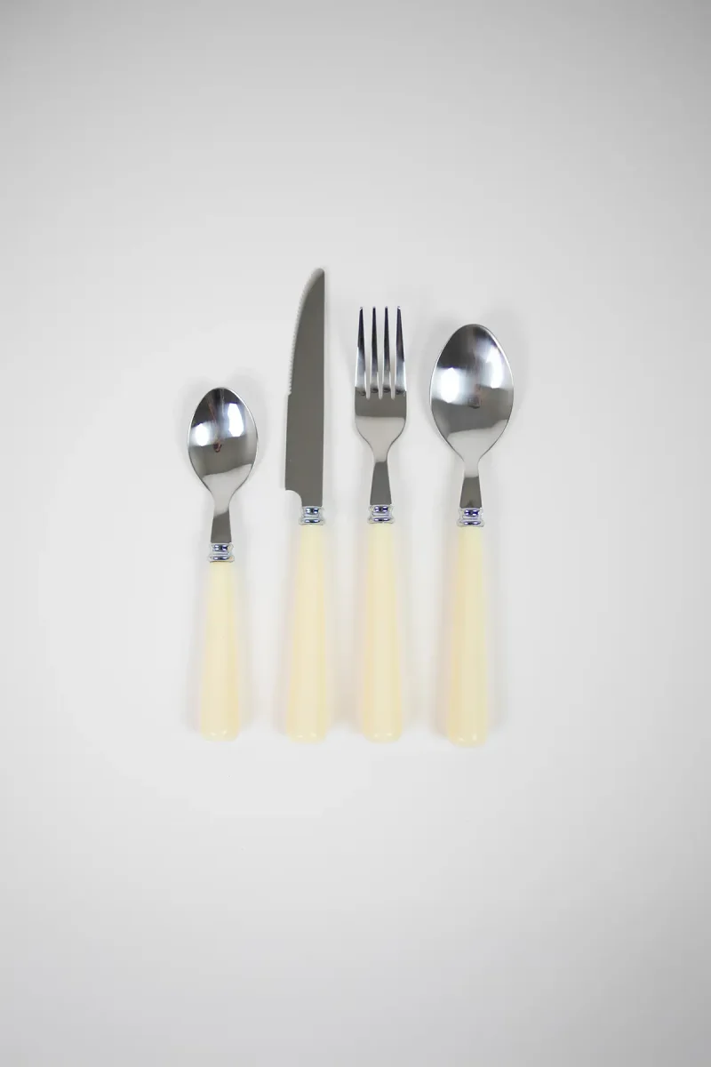 Bestick i rostfritt stål med färgade handtag i slitstark plast.