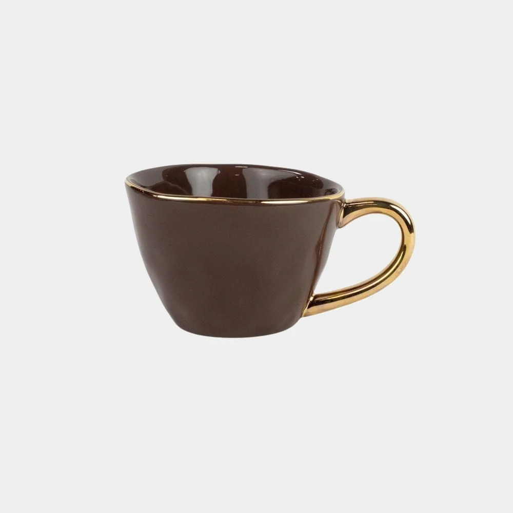 Brun kopp i keramik med guldkant och handtag i guld.