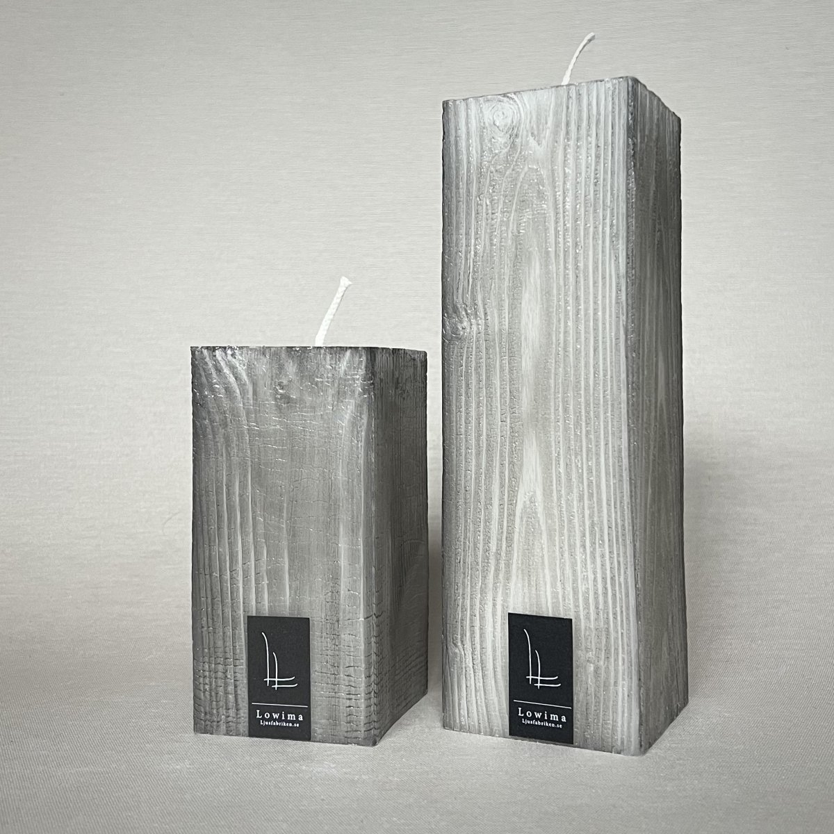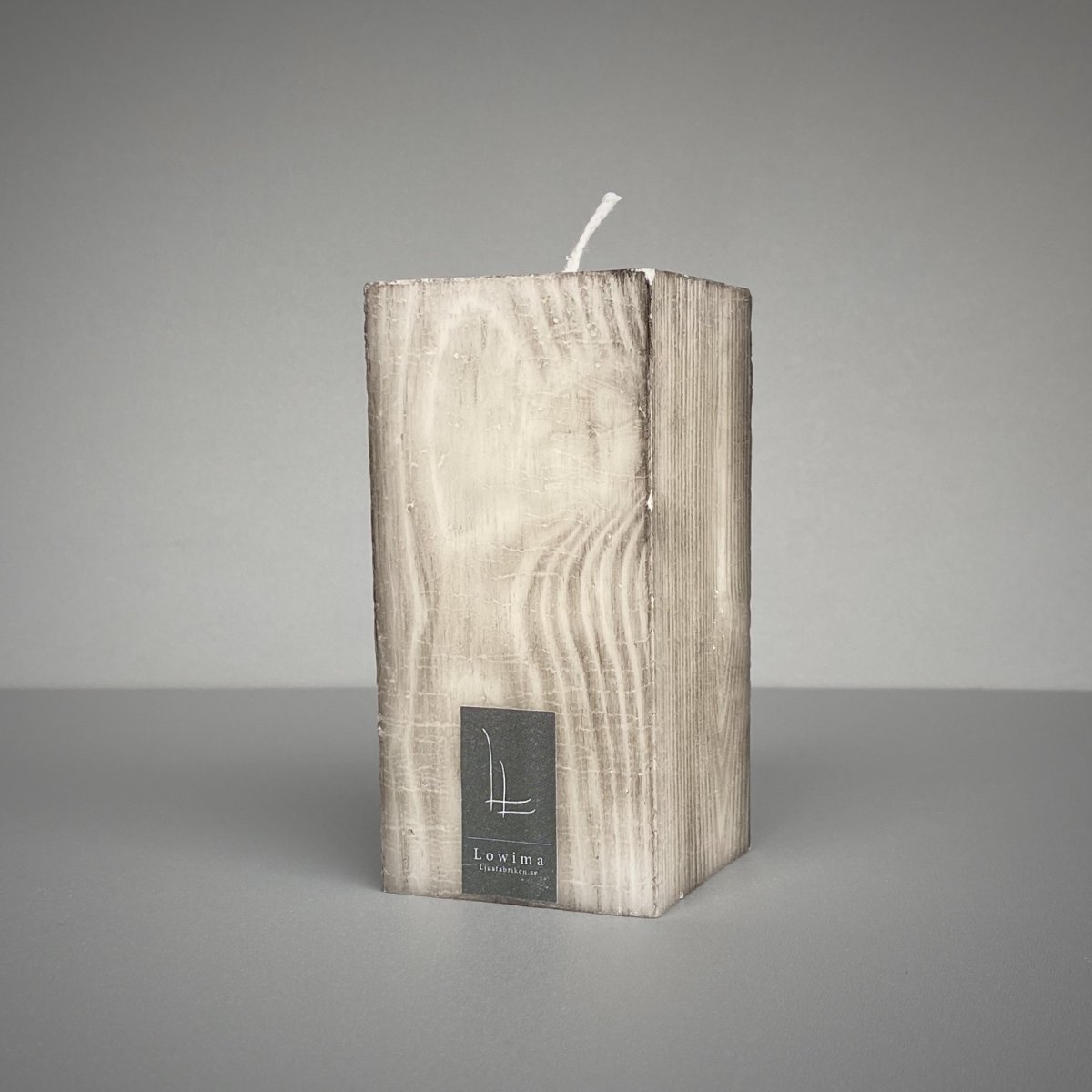 Handgjort fyrkantigt ”Träljus” som gjuts i ådrad träform, 64x64mm / höjd 125 – 200mm. Blockljuset är av 100% stearin med obehandlad bomullsveke. Träljuset är vitt och svärtas för hand utvändigt för träkänslan därför kan nyansskillnader förekomma. Alla våra hand-tillverkade 100% stearinljus kan få ett så kallat spindelnätsmönster som, beroende av eldningsmiljö blir unikt för varje ljus.