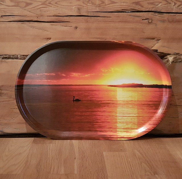 Stor oval bricka med motiv ”Svan i solnedgång”, Sundboden Design. Vi fotograferar motiv från Roslagen som sedan trycks på brickor av formpressat trä.
