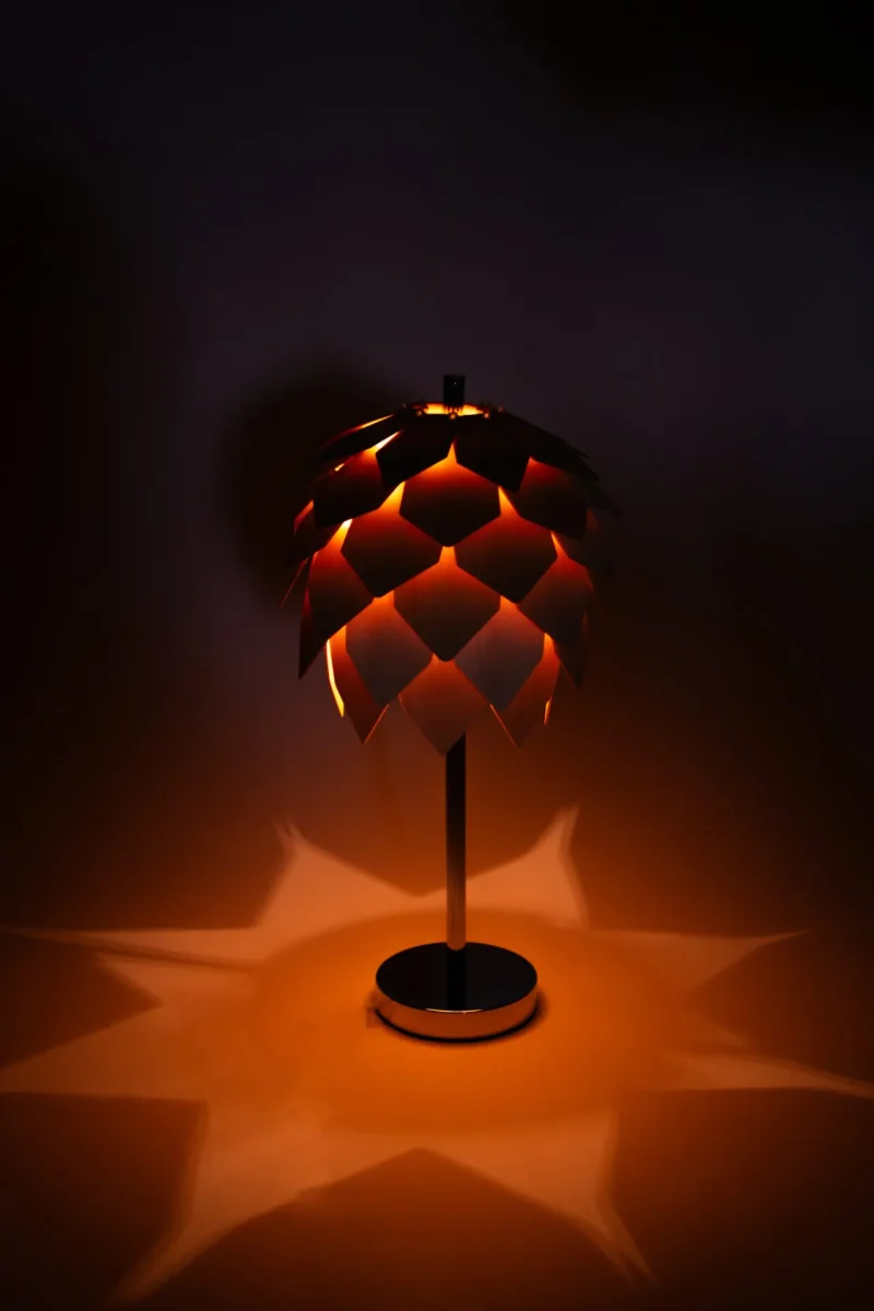 Cone har tagit steget ner – och finns nu även som bordslampa. Med sin kromade fot och den välkända kotten på toppen blir den en stilren ljuskälla i hemmet.