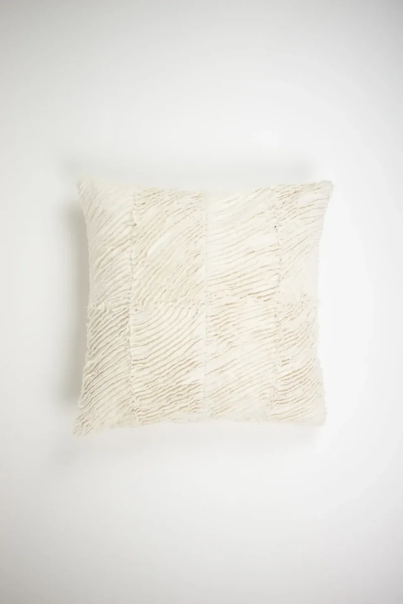 Kuddfodralets framsida är tillverkad av 100% bomullsslub, där textilremsorna är klippta med råa kanter som en del av designen. Därför kan viss fällning av bomullsfibrer förekomma.