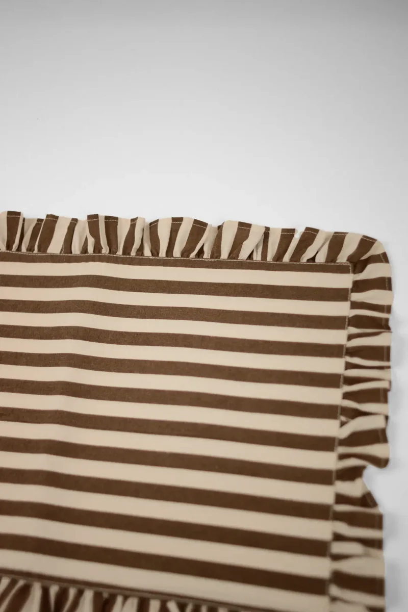 Randigt bordsunderlägg med dekorativ volangkant. En mix av romantik, cool elegans och ombonad känsla som lyfter varje dukning.