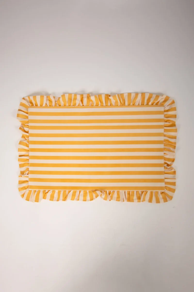 Randigt bordsunderlägg med dekorativ volangkant. En mix av romantik, cool elegans och ombonad känsla som lyfter varje dukning.