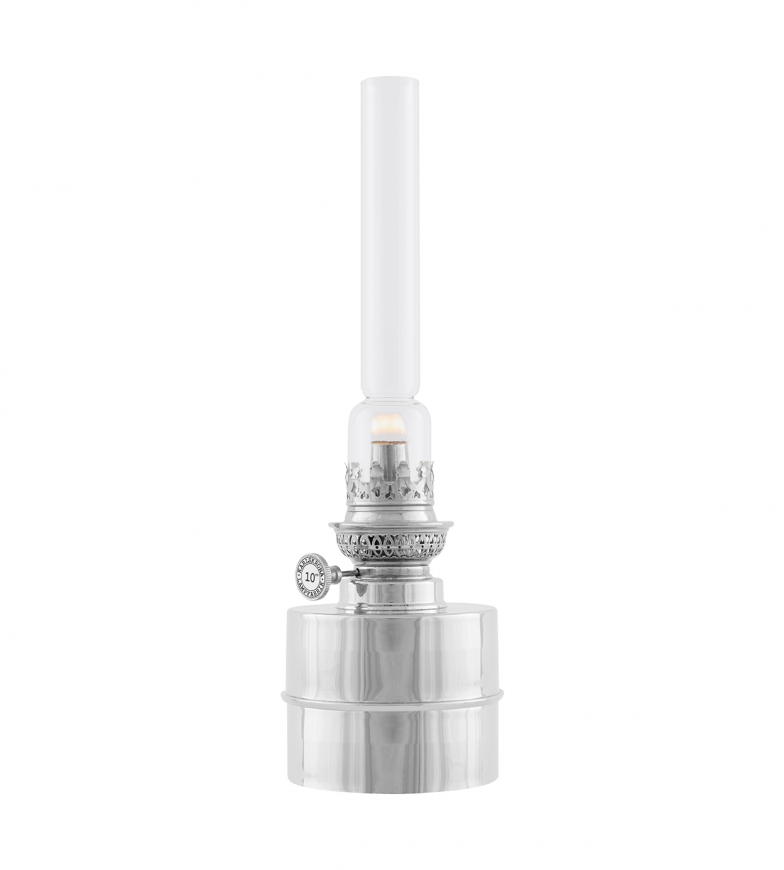 En klassisk fotogenlampa som med sitt cylinderformade oljehus helt i förnicklad mässing ger ett funktionellt och lite modernare intryck -trots att ursprungsmodellen har anor från det sena 1800-talet. Tillverkade i Sverige.