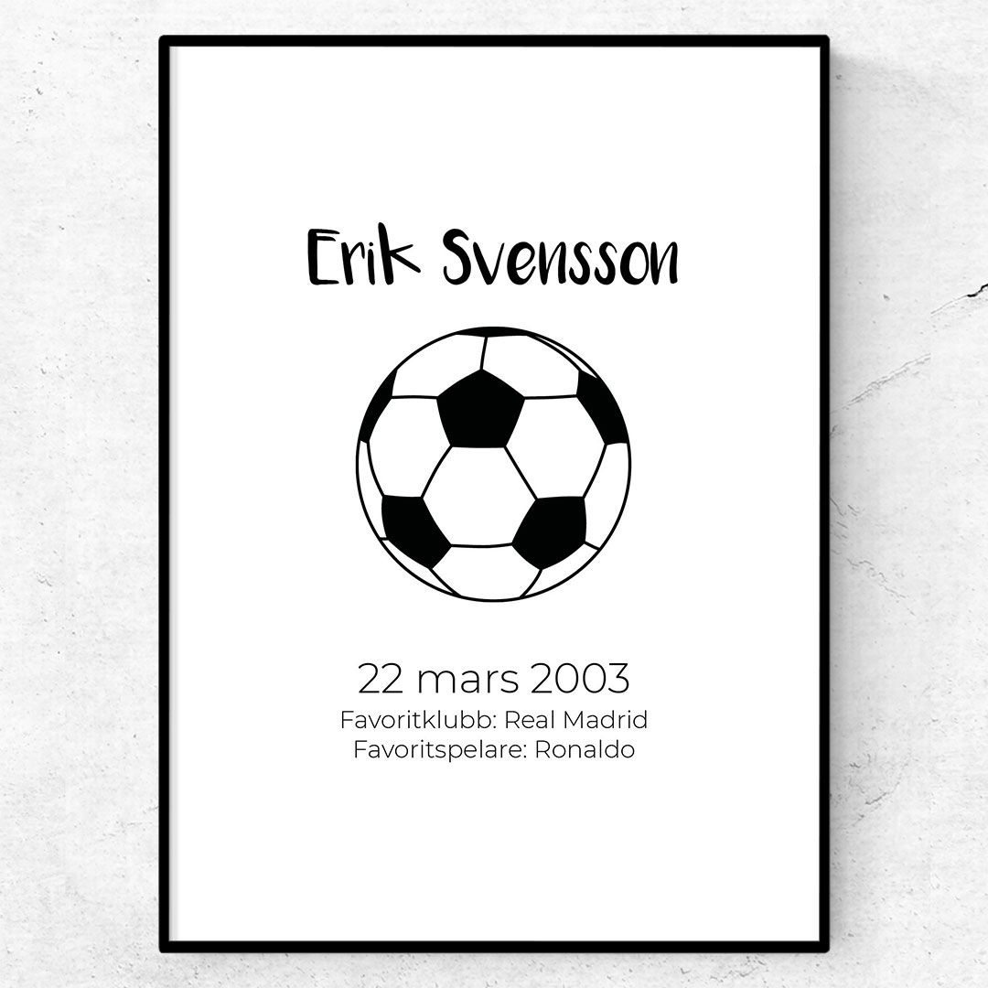 Denna poster är framtagen för att passa i rummet för den fotbollstokige tjejen eller killen. Du fyller själv i uppgifterna så som namn, födelsedatum, favoritklubb och favoritspelare. En perfekt inredningsdetalj i barnrummet.