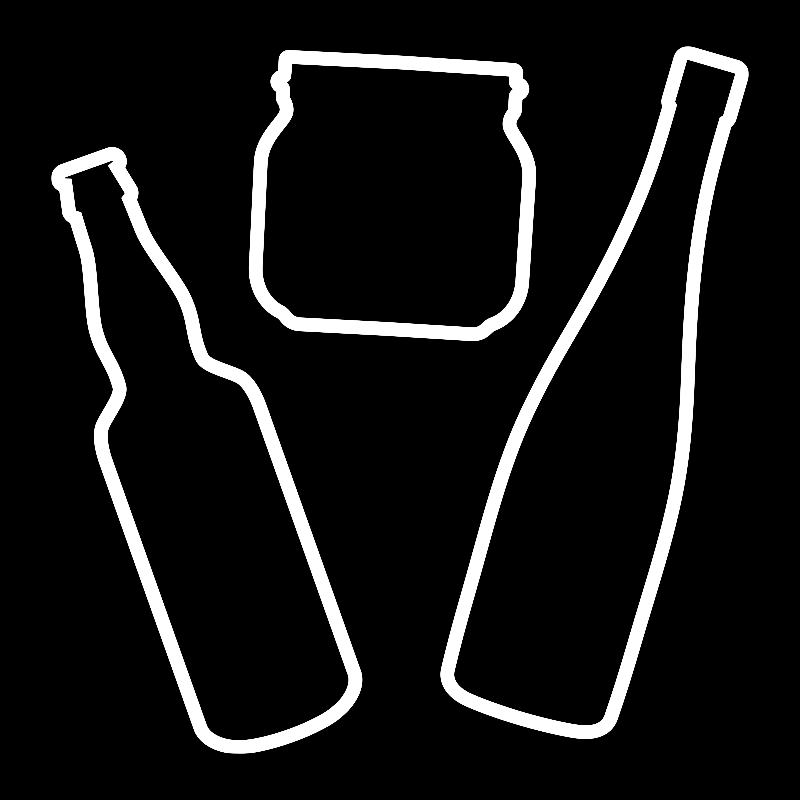 Symbol för glas att sätta på ditt kärl för källsortering av glasförpackningar. Skylten med glasflaskor och en glasburk, gör det tydligt vad som ska sorteras var.