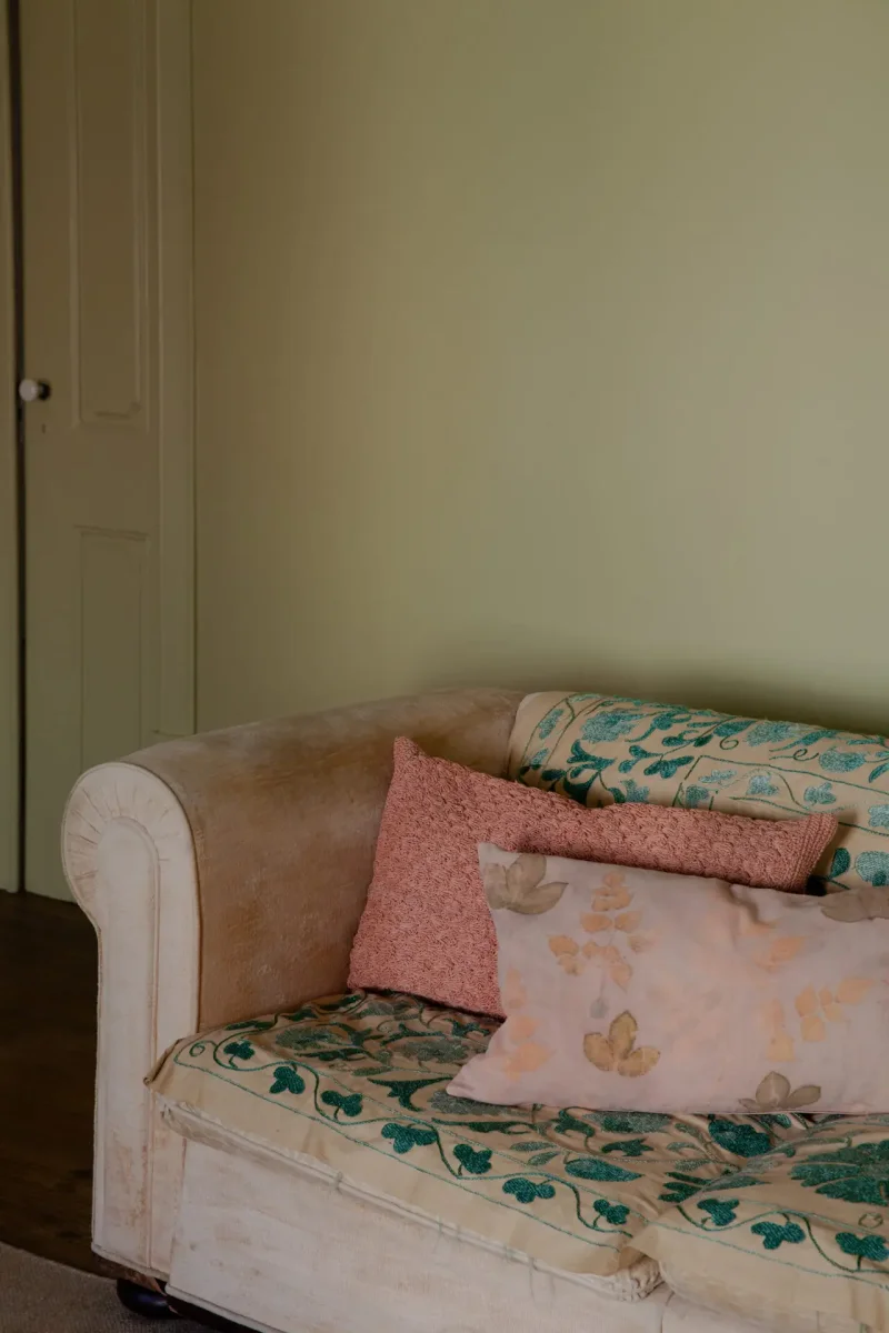 Handgjort kuddfodral tillverkat av vävd raffia, ett naturmaterial som kommer från blad på raffiapalmen. Detta ger kuddfodralet en unik karaktär och struktur.