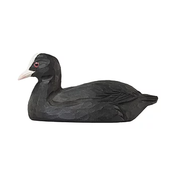 Handsnidad kapsylöppnare i form av en simmande Sothöna. Själva öppnaren i metall är infälld på undersidan och syns inte då fågeln ligger på bordet. Från Svenska märket Wildlife Garden.