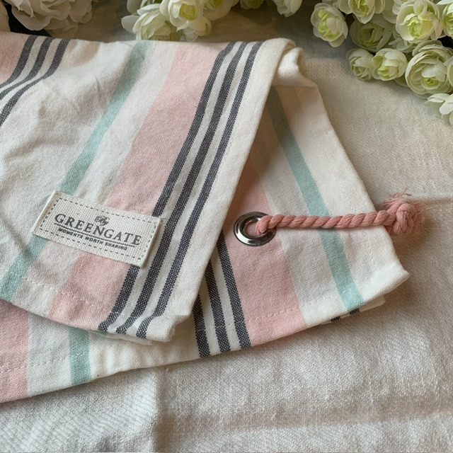 Härlig randig kökshandduk med repsnöre. Även fina som små dukar, bordstabletter, i brödkorgen. Från Danska Green Gate.