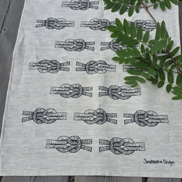 Kökshandduk/diskhandduk i tunt linne med motiv ’’Råbandsknopar”, Sundboden Design.