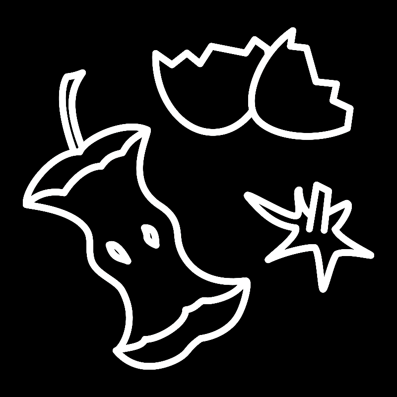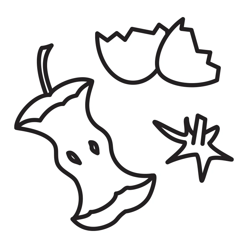 Symbol för kompost att sätta på ditt kärl för källsortering av organiskt avfall. Skylten med en liten äppelskrott, äggskal och ”flugan” från en tomat gör det tydligt var kompost ska slängas.
