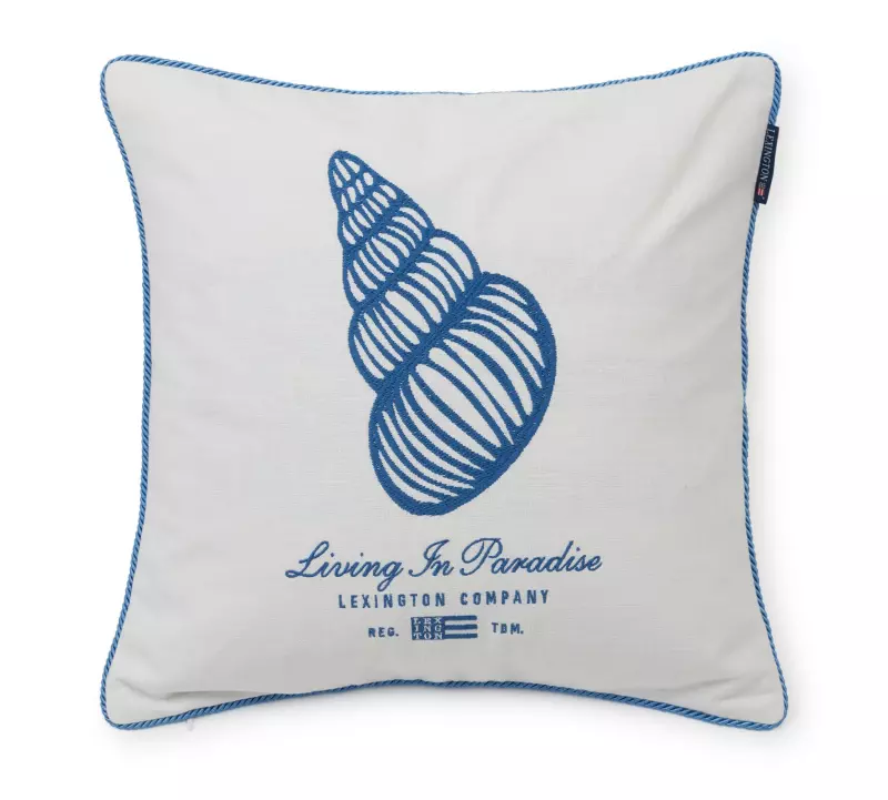 Vitt kuddfodral med broderat marint motiv på framsidan, vit på baksidan. Från Lexington.
