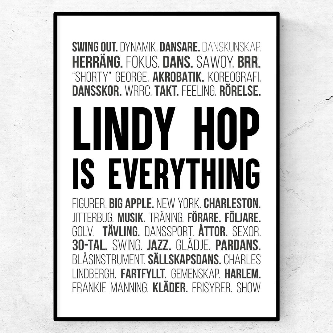 På allmän begäran har vi nu skapat en Lindy hop-poster. Postern består av texten Lindy Hop is everything omgivet av olika ord och termer från dansens värld.