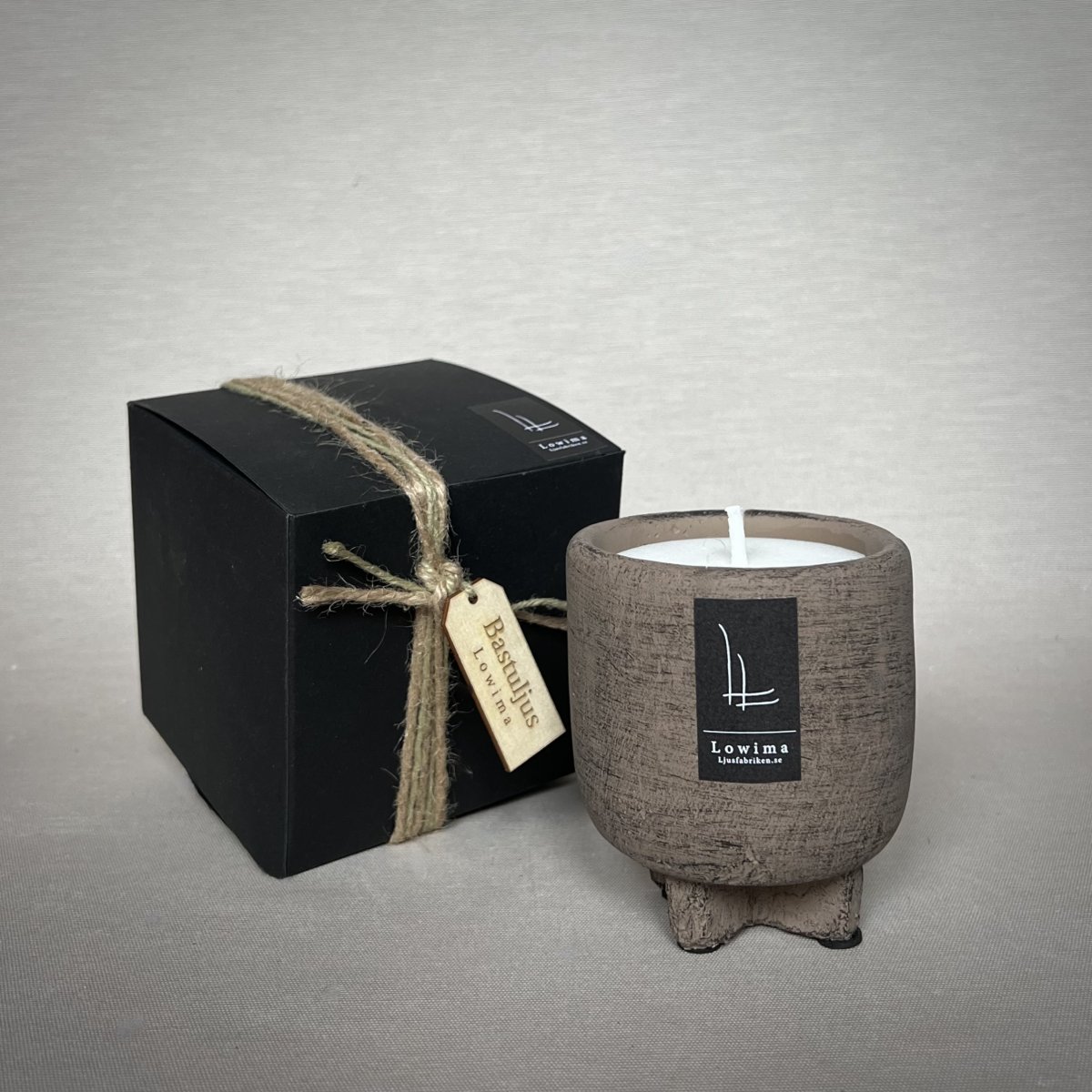 Bastuljus i kruka. Tål ånga, hög värme, är doftlöst och tillverkat av 100% stearin. Krukans mått är Ø75mm /höjd 90mm Krukan levereras i en presentask i svart papp. Brinntid på ljuset är ca 18 timmar.