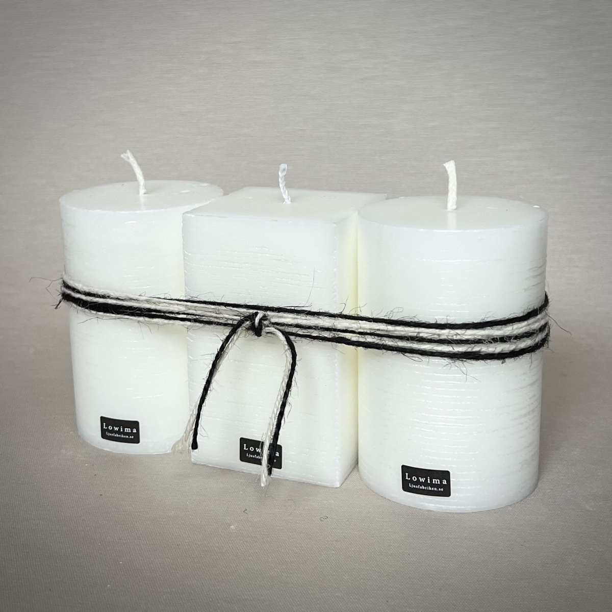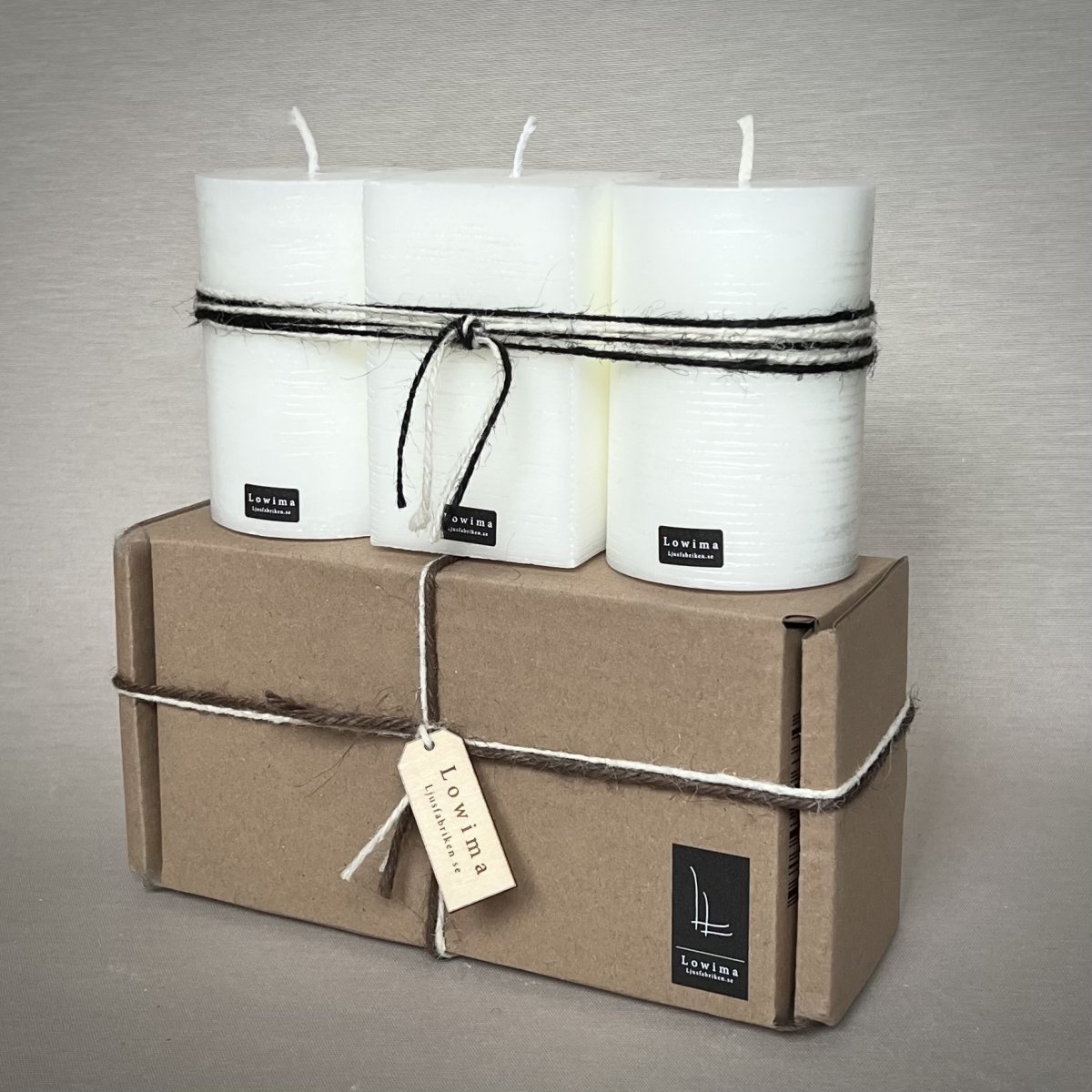 Ljuspaket innehåller 3 st Blockljus, 2 st cylinder Ø67mm / höjd 100mm och 1 st fyrkantigt 64x64mm / höjd 100mm. Inslaget i en presentbox av natur papp. Alla våra hand-tillverkade 100% stearinljus kan få ett så kallat spindelnätsmönster som, beroende av eldningsmiljö blir unikt för varje ljus.